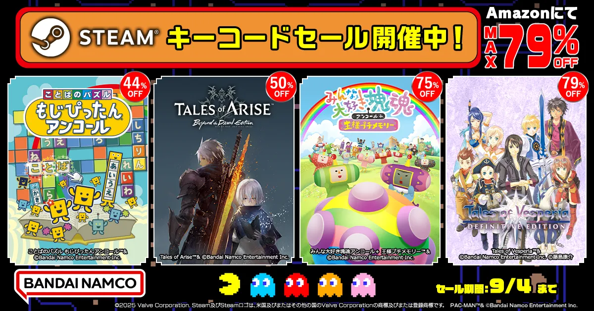 株式会社バンダイナムコエンターテインメントが、現在AmazonにてSTEAMキーコードのセールを行っています。この機会に、人気ゲームをお得にゲットしましょう!