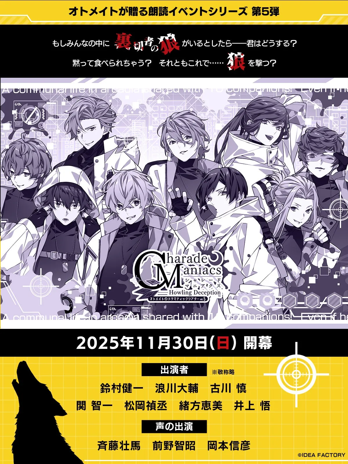アイディアファクトリーが展開する人気女性向けゲームブランド「オトメイト」が、新たなドラマティックシアターを開催します。2025年11月30日、サンシティ越谷市民ホールで行われる「CharadeManiacs -Howling Deception-」の配信チケットが、本日より販売スタートしました。同作品は2018年に発売され、斬新な世界観とキャラクター人気で今も多くのファンを惹きつけています。