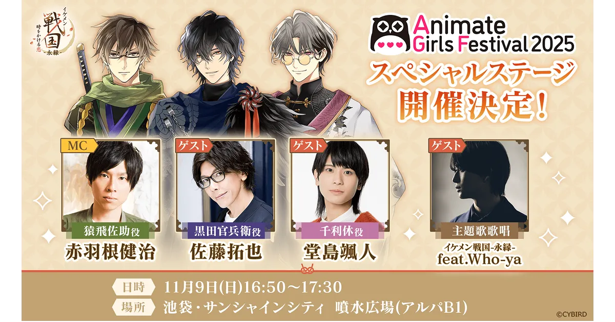 株式会社サイバードが手掛ける、全世界で大人気の恋愛ゲーム「イケメンシリーズ」最新作『イケメン戦国 時をかける恋 -永縁-』が、2025年11月9日(日)にアニメイトガールズフェスティバル2025(AGF2025)にてスペシャルステージを開催することが決定しました。シリーズ累計会員数はなんと4,500万人を超えるこの作品。今回のステージでは、豪華キャストと主題歌アーティストが参加し、特別なトークや企画が展開されます。