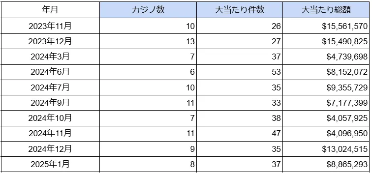 2025年1月に記録された大当たり件数は、合計37件で、8つのカジノからの結果が集計されています。特に注目すべきは「モヒガン・サン」での大当たりで、最高額の1,374,171ドル(約2.1億円)が舞い込みました。このような高額当たりがある一方で、「アクウェサネ モホーク カジノ リゾート」は、25件の大当たりを記録しており、安定した高頻度の勝利を見せています。