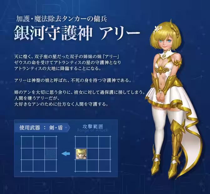 アトランティカの大地において、強大な力を持つ傭兵としてプレイヤーをサポートします。彼女の能力は、冒険を促進するために設計されており、皆さんの戦略的な戦いに欠かせない存在となるでしょう。