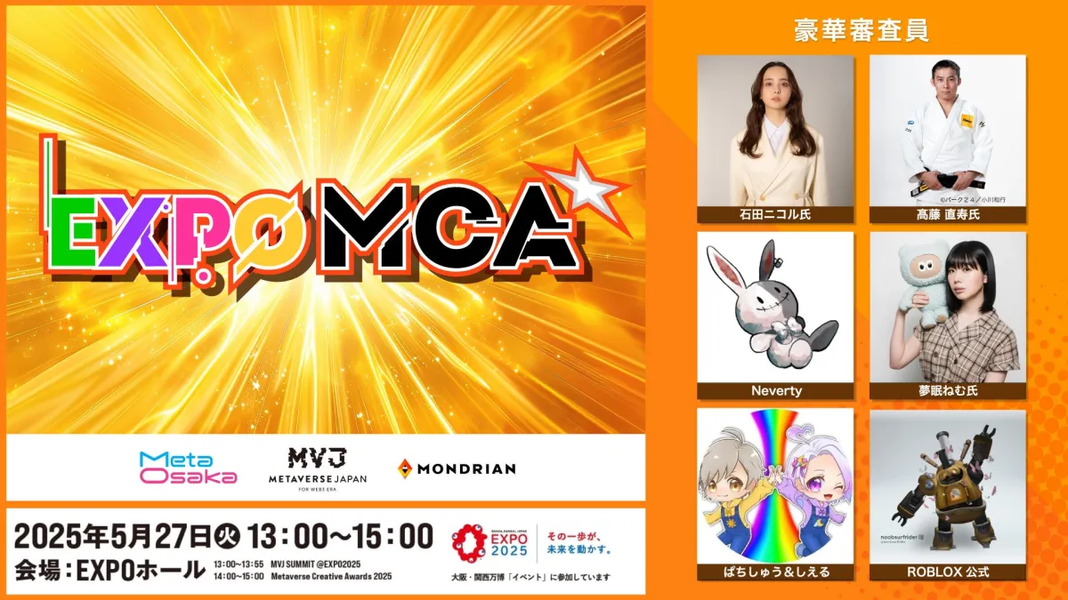 2025年5月27日、大阪・関西万博会場のシャインハットにて、初となるメタバースアワード『EXPO MCA』が開催されました。この授賞式は、Meta OsakaおよびMetaverse Japanの主催によるもので、これまでオンライン中心の授賞式であった『EXPO MCA』がリアルの場で行われることとなりました。