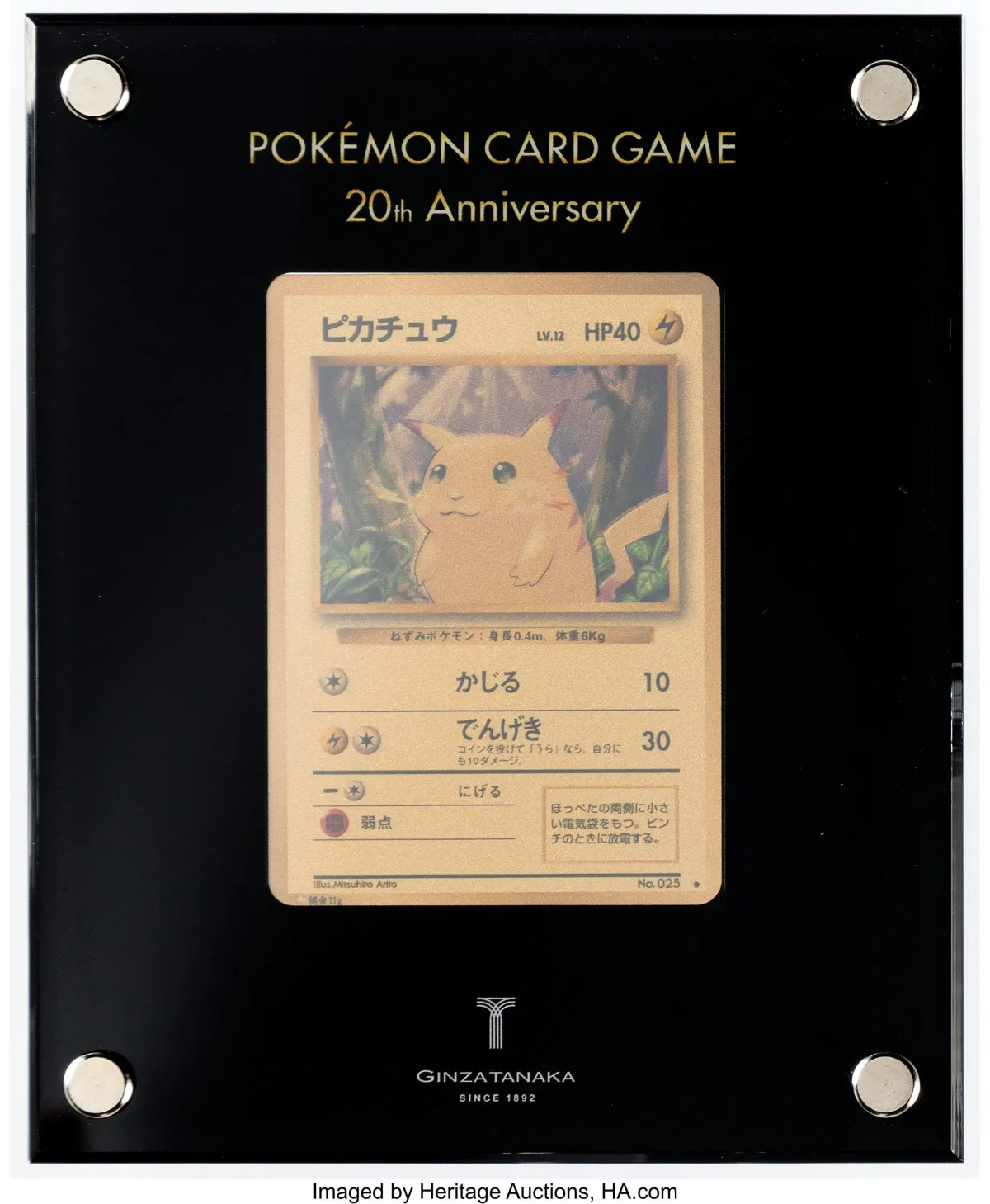 2025年4月17日に開催された第1弾オークションでは、特に記念すべきピカチュウの24金製カードが出品されました。このカードは、ポケモン20周年を祝して制作されたもので、965年のポケモンの誕生以来、数多くのファンに支持されてきたポケモン文化のシンボルとも言える存在。落札額はなんと$35,000(約525万円)という驚異的な値段で取引され、コレクターの間で非常に高い評価を得ました。このカードは日本の田中貴金属が制作したもので、初期のピカチュウカードを精巧に再現した逸品です。
