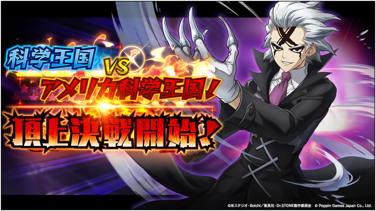 ポッピンゲームズジャパン株式会社が運営するモバイルゲーム『Dr.STONE バトルクラフト』において、待望の新イベント「科学王国VSアメリカ科学王国!頂上決戦開始!」が始まりました。このイベントは、2月28日(金)の18:00から3月11日(火)の14:59まで開催され、プレイヤーはイベント専用ステージをクリアすることでスコアを獲得し、豪華報酬を手に入れることができます。