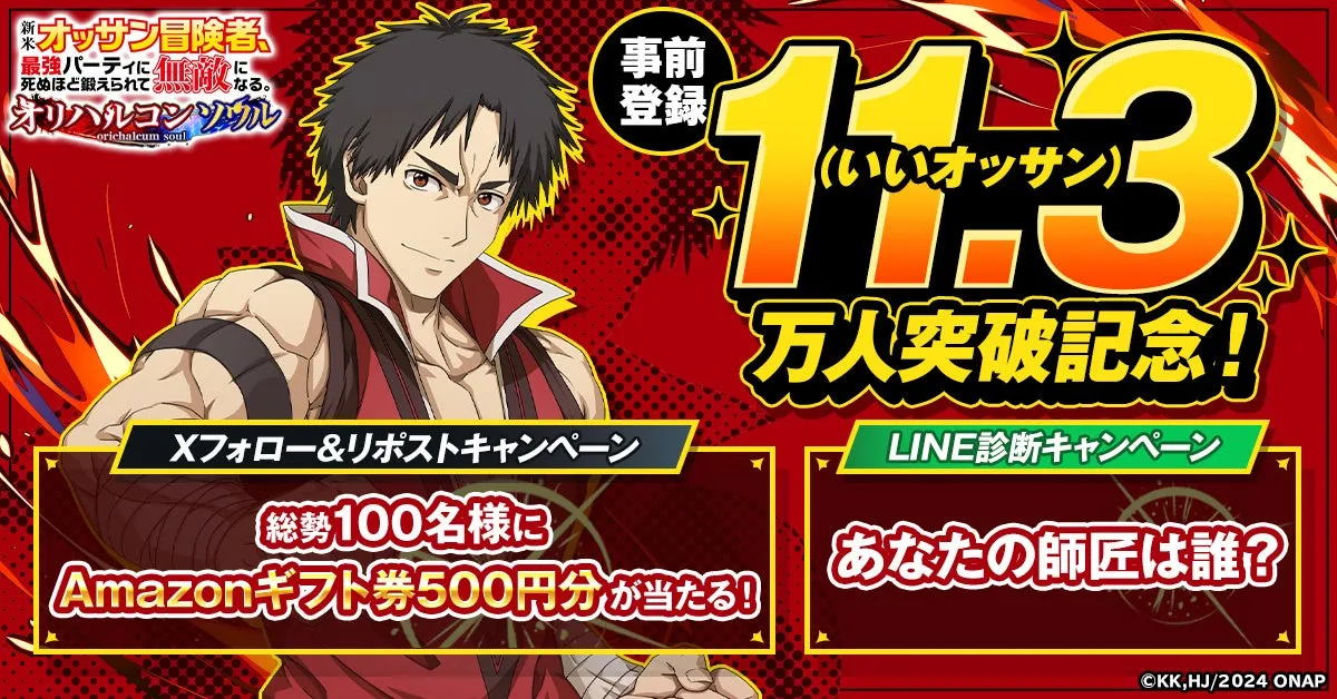 CTW株式会社が手がけるHTML5ゲーム『新米オッサン冒険者、最強パーティに死ぬほど鍛えられて無敵になる。オリハルコンソウル』の事前登録者が、ついに11.3万人を超えました。これは「いいオッサン」とも呼ばれ、ファンにとっては喜ばしいニュースです。この素晴らしい成果を記念して、公式XやLINEで特別キャンペーンが開催されているので、ぜひ参加してみてください。