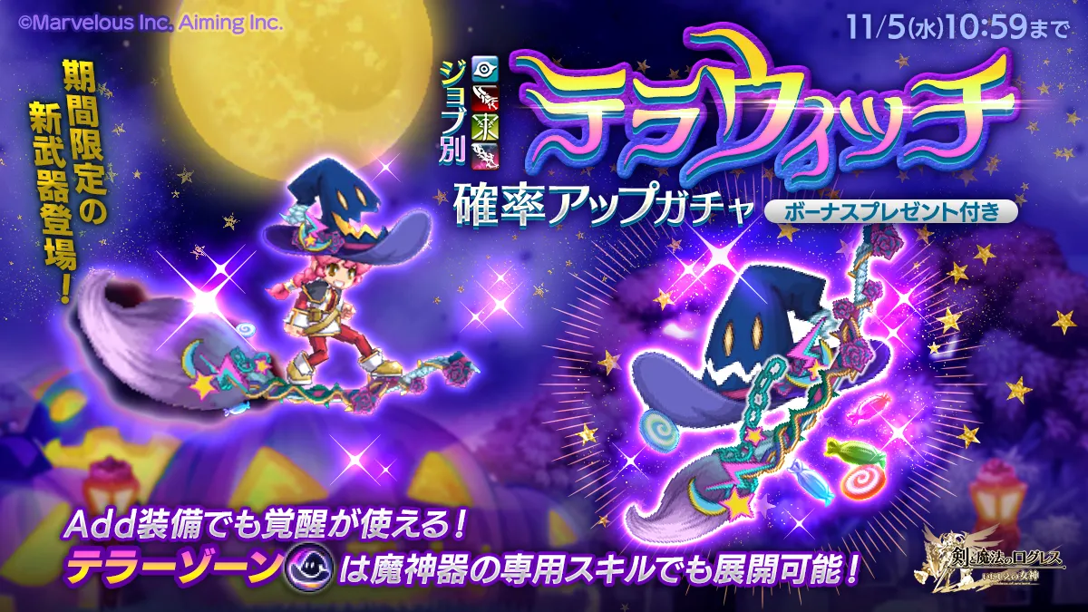 まず注目すべきは、「ジョブ別 テラウィッチ確率アップガチャ」の実施です。期間限定で「テラウィッチの専用武器・古代機」が登場し、闇属性の各種武器(古代機、覇剣、霊刀、滅剣)が確率アップ。これらの武器は、EXスキル効果によりAdd装備でも覚醒スキルが使用可能と、非常に強力な性能を備えています。