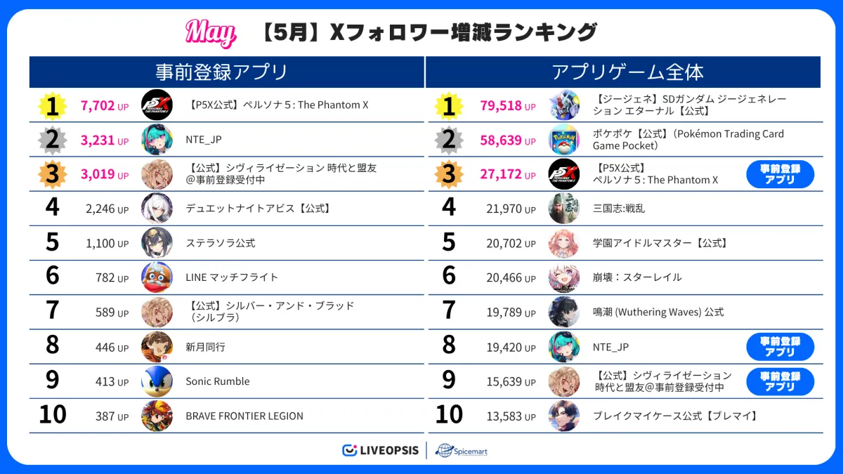今回の調査は2025年5月1日から28日にかけて行われ、スパイスマートが運営する『LIVEOPSIS』から得たデータをもとにフォロワー数の変動を詳細に分析しました。その結果、事前登録中のタイトルがリリース済みのタイトルに対しても高い注目度を持っていることが明らかになりました。