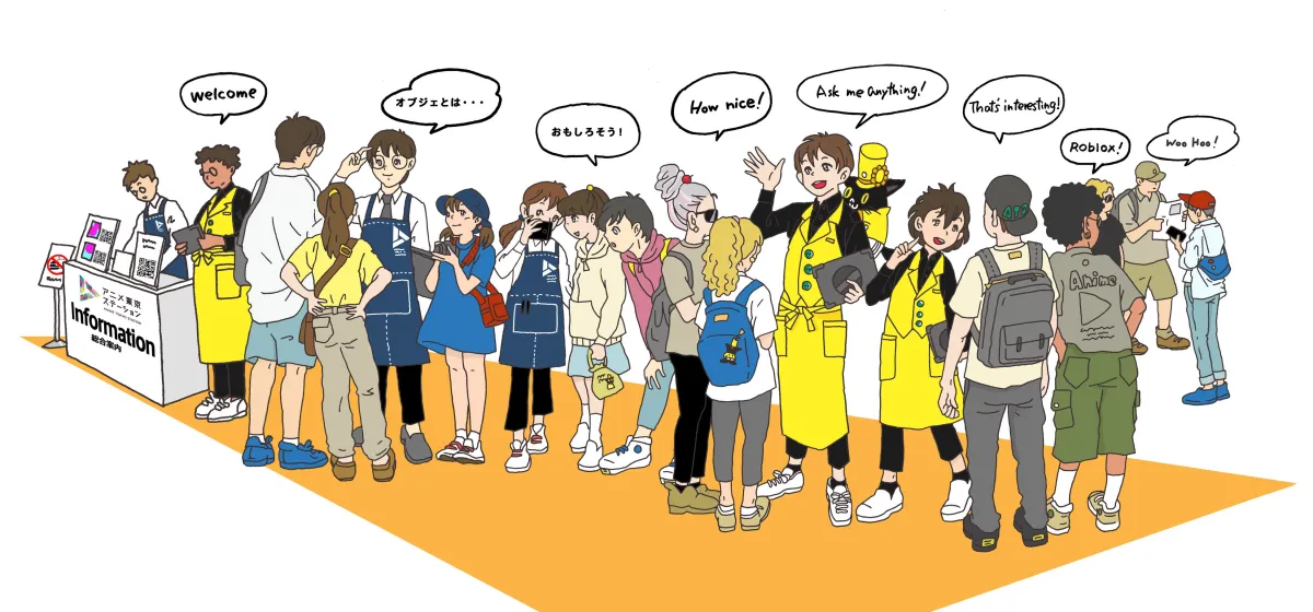 新しく配属された「コミュニケーター」は、黄色いユニフォームを身にまとったアニメファン。彼らの役割は、海外からの来館者に素晴らしいアニメ体験を提供することです。多言語対応で、館内の案内のみならず、東京のアニメ関連イベントやスポット情報もシェアします。また、メタバース空間『ANIME TOKYO STATION ON ROBLOX』に登場し、オンラインでもアニメ愛を広めるサポートを行います。