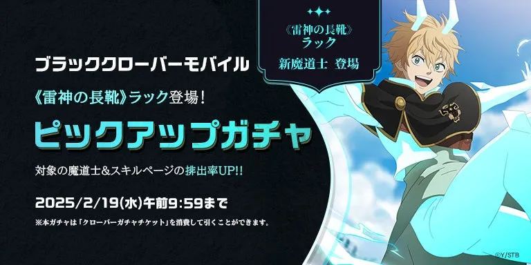 株式会社VIC GAME STUDIOS JAPANが手掛けるアプリゲーム『ブラッククローバーモバイル 魔法帝への道 The Opening of Fate』に、待望のSSR魔道士が新たに登場しました。この新キャラクターは、アニメ『ブラッククローバー』でもおなじみの「《雷神の長靴》ラック」です。彼の紹介や、関連するキャンペーン情報をお届けします。
