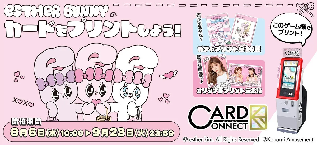 株式会社コナミアミューズメントは、アミューズメント施設向けのカードプリントゲーム機『カードコネクト』に、韓国のイラストレーターエスター・キム氏が手掛けたキャラクター『エスターバニー』とのコラボデザインイベントを発表しました。このイベントは、2023年8月6日から9月23日まで開催されます。