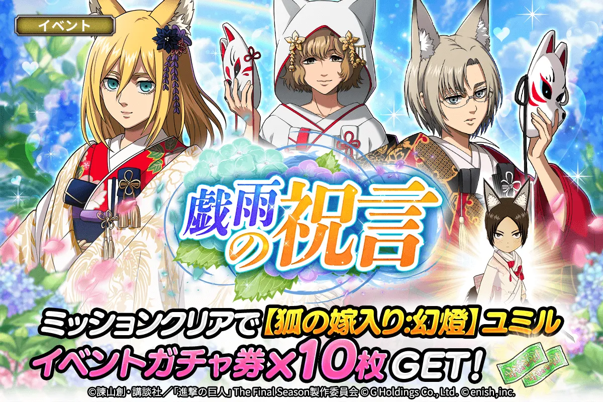 株式会社enishが開発したスマートフォンゲーム「進撃の巨人Brave Order」が、2025年5月30日(金)より新イベント「戯雨の祝言」をスタートさせました。このイベントでは、新キャラクターや特別なガチャが導入され、プレイヤーに新たな楽しみを提供します。日本だけに留まらず、全世界の『進撃の巨人』ファンに向けた魅力的なコンテンツが展開されます。