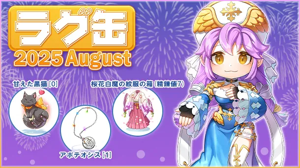 「ラグ缶2025 August」は、ラグナロクオンラインのアイテムが手に入るくじ引き形式の販売商品です。過去のラグ缶も人気を博しており、今回も新たなアイテムが盛りだくさんです。特に注目は「甘えた黒猫[0]」、「桜花白魔の紋服の箱(精錬値7)」、「アポテオシス[1]」の3種類で、どれもプレイヤーにとって魅力的な存在です。