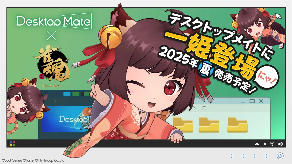 株式会社インフィニットループが提供するデスクトップマスコットプラットフォーム「Desktop Mate」の新たなDLCが発表されることとなりました。2025年夏には、オンライン麻雀ゲーム「雀魂-じゃんたま-」の人気キャラクター「一姫」が、デフォルメデザインで「ちび一姫」として登場します。