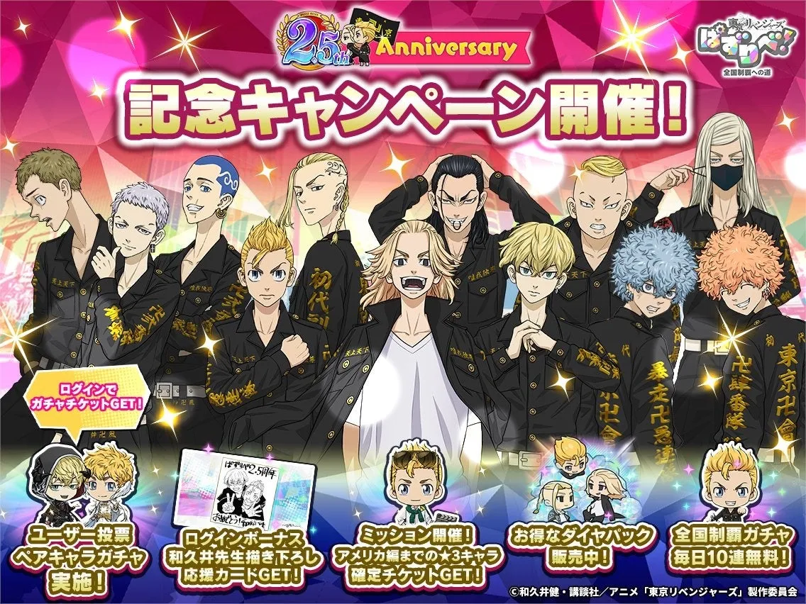 人気スマートフォンゲーム「東京リベンジャーズ ぱずりべ! 全国制覇への道」が、2.5周年を迎え、特別なキャンペーンを展開しています。このゲームは、東京リベンジャーズのキャラクターたちを集め、自分だけの東京卍會を築き上げていくパズルRPGで、全国制覇を目指す内容です。6月8日から始まるキャンペーンでは、様々なイベントが用意されています。