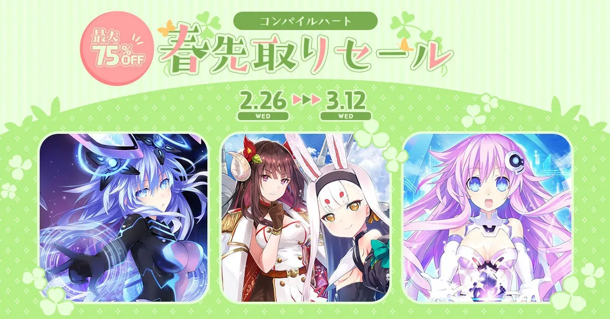 2023年2月26日(水)より、コンパイルハートが展開する《春先取りセール》が、ニンテンドーeショップとPlayStation®Storeにて開催されています。このセールでは、知名度の高い人気タイトルが大幅割引で手に入るチャンスです。特に注目すべきは、PS4版の『新次元ゲイム ネプテューヌVⅡ』。通常価格6,600円(税込)からなんと70%OFFの1,980円(税込)で提供されています。Nintendo Switch™版も60%OFFの1,920円(税込)で購入可能です。