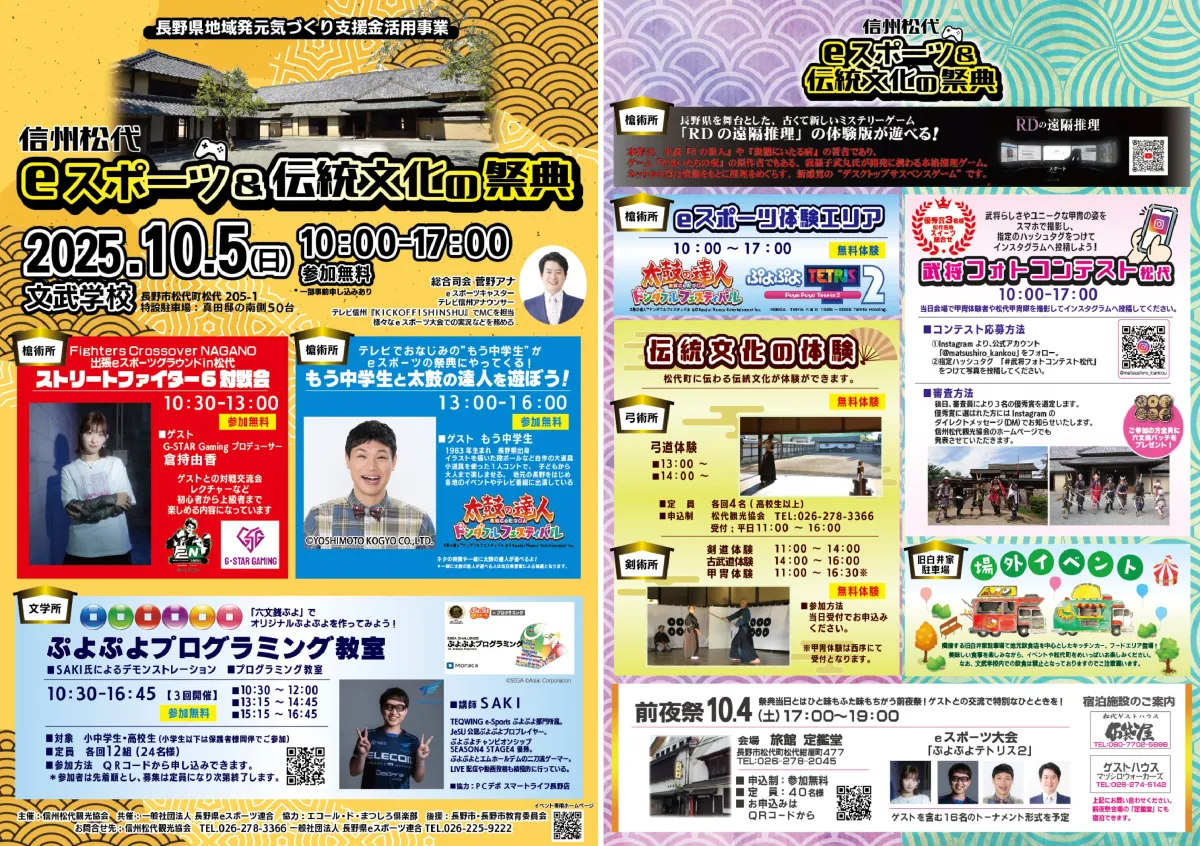 この祭典への参加は無料ですが、ぷよぷよプログラミング教室は事前応募が必要です。弓道体験に関しては、信州松代観光協会へ電話でお問い合わせを。主催は信州松代観光協会、協力団体には長野県eスポーツ連合などが名を連ねています。