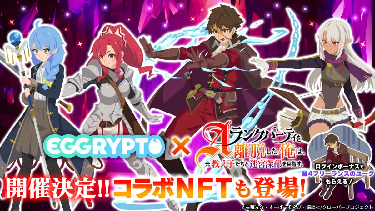 NFTゲーム「EGGRYPTO(エグリプト)」が、人気アニメ「Aランクパーティを離脱した俺は、元教え子たちと迷宮深部を目指す。」とのコラボイベントを開催します。イベントは2025年3月14日(金)12時からスタートし、3月28日(金)12時までの期間限定で行われます。このイベントでは、お馴染みのエパリダキャラクターが登場し、コラボクエストではレアモンである「赤魔道士ユーク」と「クローバーの三人娘」が数量限定で登場します。