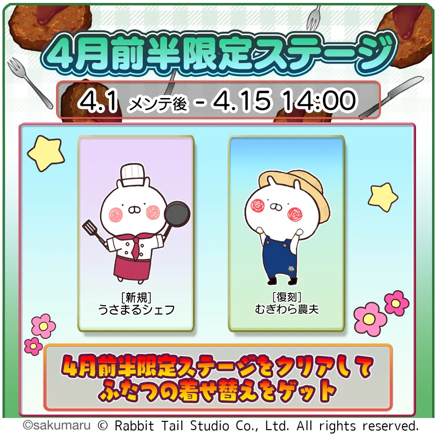 新ステージは、4月1日(水)メンテナンス後から4月15日(水)14:00までの期間限定で楽しむことができ、期間中に指定された条件を達成することで新しい具材を獲得できます。