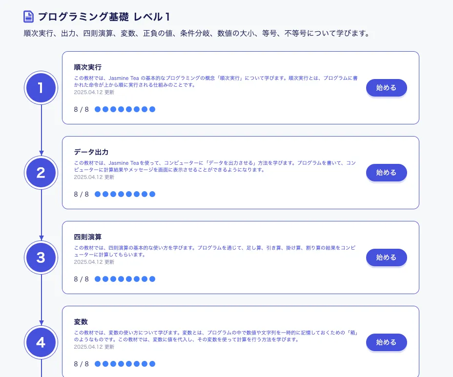 このように「Jasmine Tea」は、初めてプログラミングに挑戦する方々にとって理想的な学ぶ環境を提供しています。新機能を活用することで、プログラミングの基礎を楽しく身につけると同時に、将来的にPythonやJavaScriptといった他の言語を学ぶ際にも、確かな基盤を築くことができます。