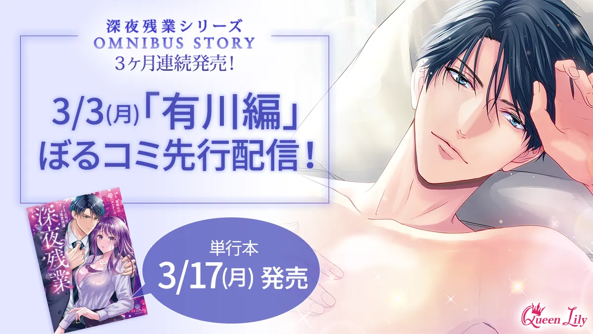また、シリーズ第1作となる「深夜残業Vol.1」有川編のコミカライズ作品も、3月17日に紙単行本として発売される予定です。作画は蓮城はに先生が手掛けており、特典として美しいイラストや描き下ろしペーパーも用意されています。さらに、購入特典としてショートストーリーを楽しむことができるので、ぜひ手に取ってみてください。