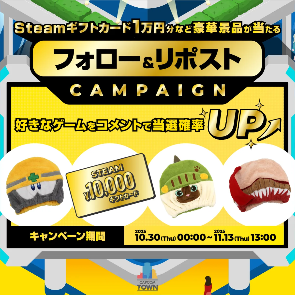 キャンペーンは2025年10月30日(木)から11月13日(木)13:00までの期間限定で行われます。期間中、カプコンタウン公式Xアカウント(@capcomtown)をフォローし、対象の投稿をリポストすることで応募が完了します。
