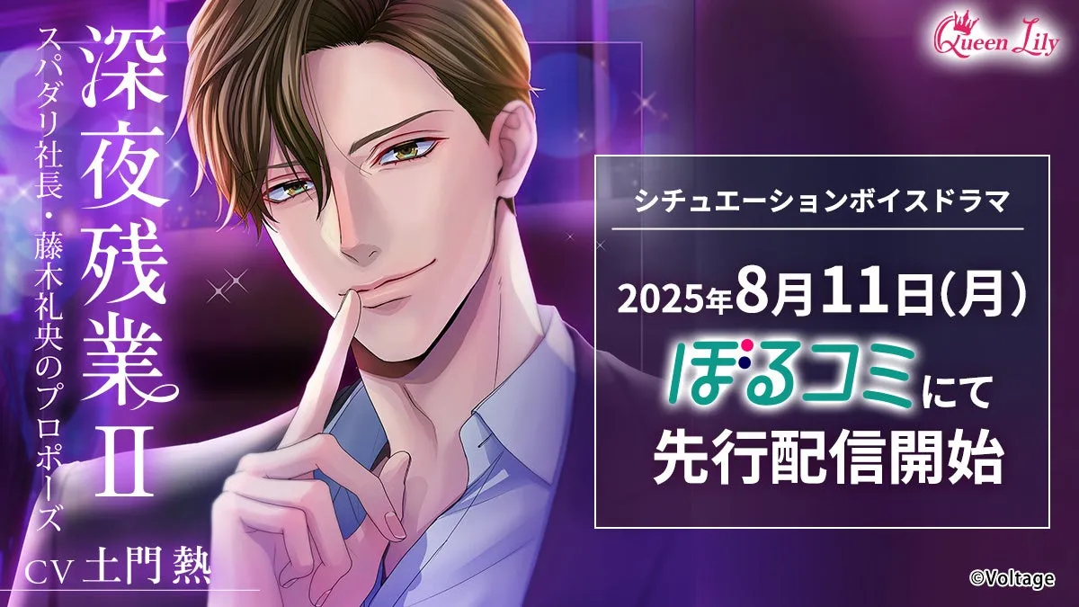 人気シチュエーションボイスドラマ「深夜残業」の続編、『深夜残業Ⅱ ~スパダリ社長・藤木礼央のプロポーズ~』が2025年8月11日から「ぼるコミ」にて先行配信されることが発表されました。演じるのは実力派声優の土門熱さん。ストーリーはオフィスの甘くてスパイシーな恋愛模様を描いており、高い人気を誇る作品です。