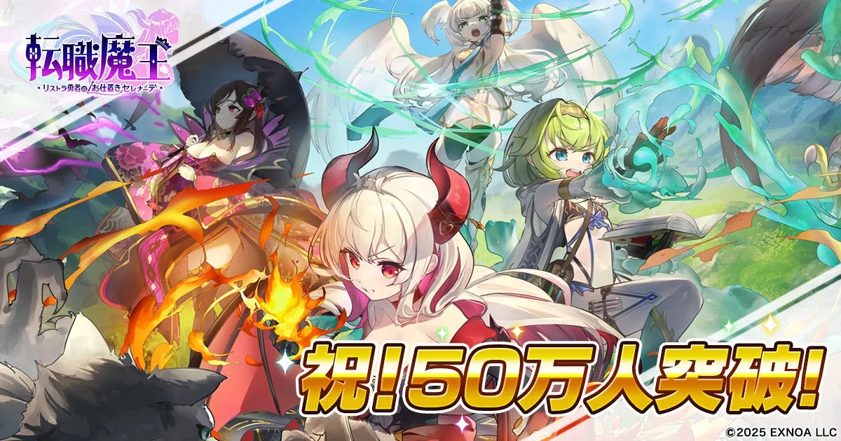 合同会社EXNOAが提供する人気ゲーム『転職魔王~リストラ勇者のお仕置きセレナーデ~』が、ついにユーザー数50万人を突破しました。この記念すべき瞬間を祝って、ゲーム内では豪華なログインボーナスが実施されています。2025年3月19日(水)メンテナンス後から4月30日(水)メンテナンスまで、毎日ログインすることで、最大9,000個の「竜神石」やキャラクター「アヤハ」などを獲得できます。日々のプレイに役立つアイテムを手に入れるチャンスです!