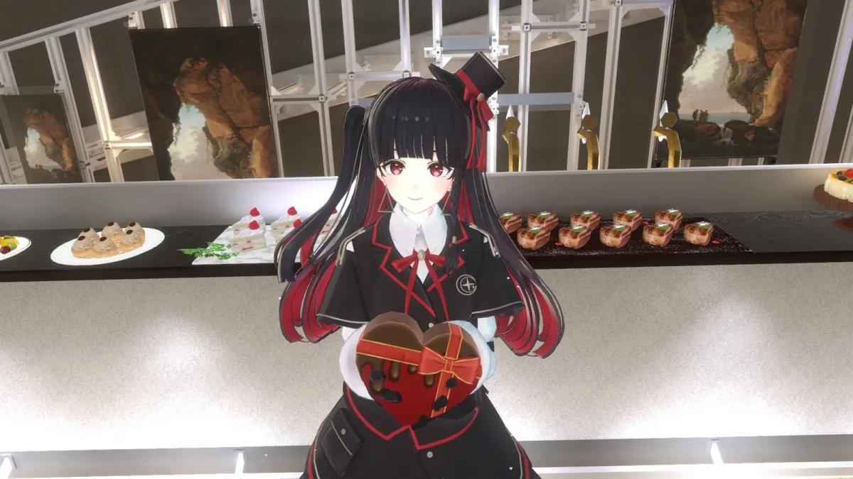 今回のアップデートでは、アバターが持ち歩けるバージョンと、仮想空間に設置可能なバージョンという二つのスタイルが実装されました。観客とのインタラクションが深まり、箱を開けるとハートが飛び出すユニークな演出が追加されています。さらに、箱から取り出したチョコをアバターの顔に近づけると、アバターがチョコを食べるという楽しいギミックが実装されています。