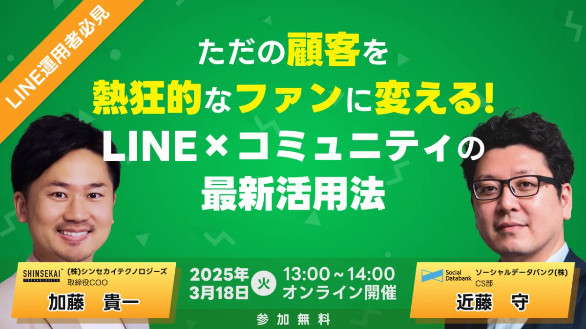 株式会社SHINSEKAI Technologiesとソーシャルデータバンク株式会社が共催する無料ウェビナーが、2025年3月18日(火)に開催されます。オンライン形式で行われ、参加は無料です。このウェビナーでは、企業がどのようにして顧客との接点を強化し、ただの顧客を熱心なファンに変えられるかに焦点を当てています。
