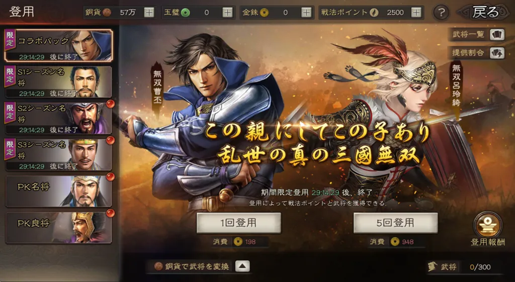 限定武将が再登場するこの機会、お見逃しなく!3つのシーズン名将パックや『真・三國無双8 Empires』のコラボ武将が手に入ります。過去の強力な武将を獲得できるチャンスですから、ぜひ参加してください。