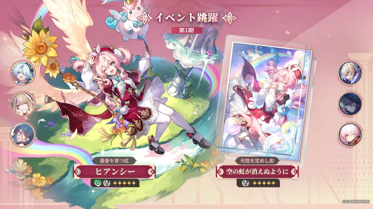 今回のアップデートで、新しく登場するキャラクターは星5の「ヒアンシー」です。CVを担当するのは、人気声優の羊宮妃那さん。ヒアンシーの登場に伴って、イベント跳躍「晨昏を穿つ虹」も開始され、この間はヒアンシーの出現率が格段にアップします。また、イベントと同時に新しい光円錐「空の虹が消えぬように(記憶)」もお見逃しなく。これらのアイテムを手に入れることで、さらに戦略的なプレイが可能になります。