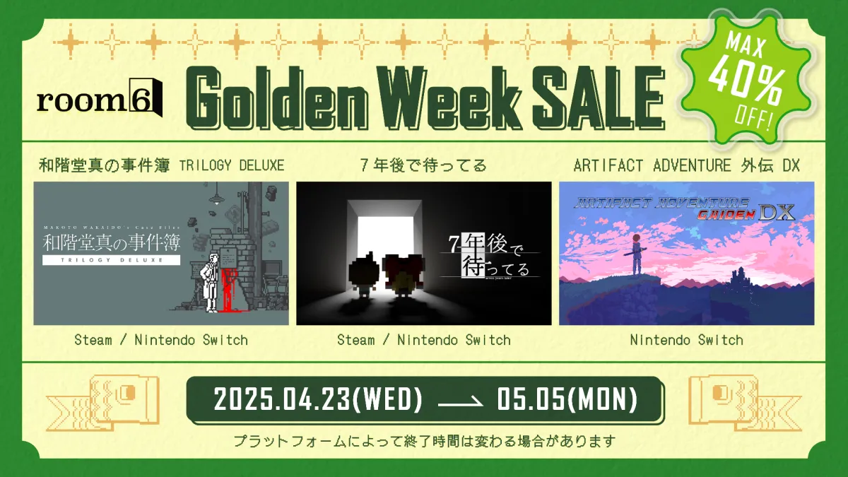 株式会社room6(本社:京都市左京区、代表取締役:木村征史)は、2025年4月23日(水)から2025年5月5日(月・祝)まで、人気ゲームのGWセールを実施します。ニンテンドーeショップとSteamストア両方で、最大40%のディスカウントが楽しめるこの機会に、ぜひ新しいゲームを手に入れましょう。