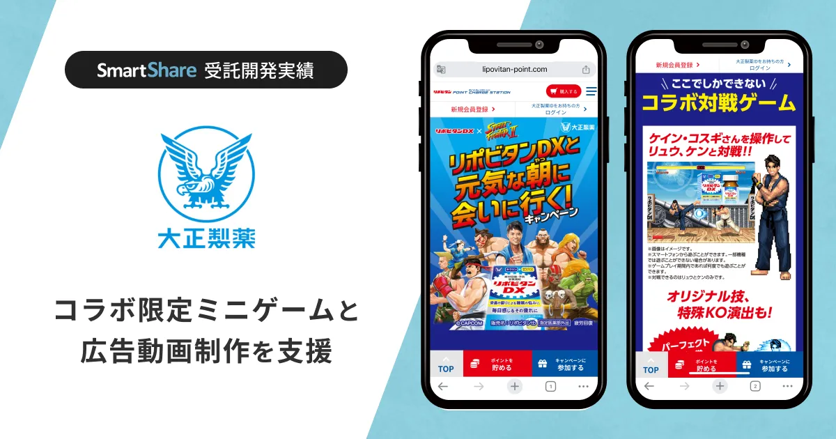 本キャンペーンにおいて、スマートシェアは企画段階から深く関与しました。対戦格闘ゲームに加え、ベルトコンベアアクションやさまざまなミニゲーム集のアイデアも提案し、プロジェクトチーム内でのビジュアルイメージの共有がスムーズに行える体制を整えました。その結果、リポビタンDXのブランドイメージとストリートファイターの世界観が見事に融合した、すべての年齢層が楽しめるミニゲームが完成しました。