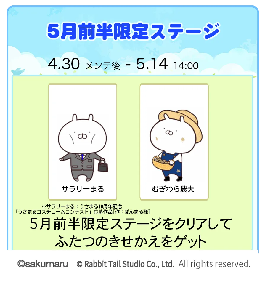 「うさまるキッチン」では、2025年4月30日(水)から5月14日(水)まで、前半限定ステージを開催します。この期間中にステージをクリアすると、かわいい「サラリーまる」と「むぎわら農夫」の着せ替えを手に入れることができます。特に今回のステージは、開催頻度が増えたため、各開催の期間が短くなっていますので、こまめにチェックして早めに挑戦しましょう!
