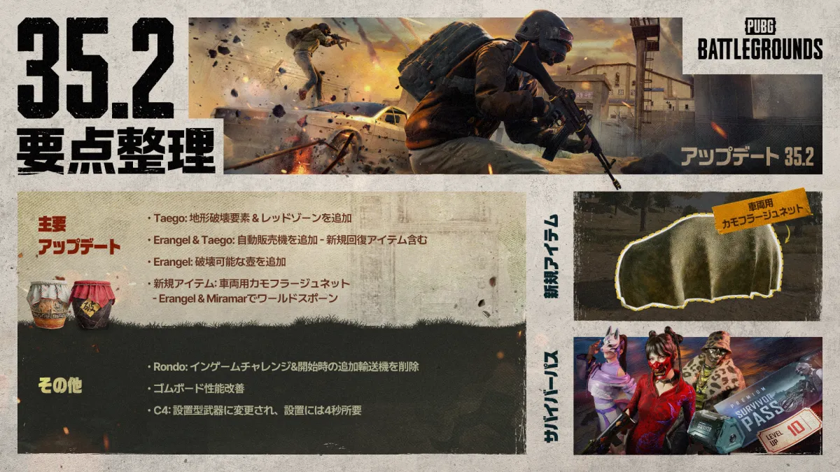 このように、『PUBG: BATTLEGROUNDS』のアップデート35.2は、プレイヤーに新たな戦略的選択肢を提供し、ゲームプレイを進化させる多くの新要素を導入しました。アップデートの詳細な情報は公式チャネルで随時更新されていますので、ぜひチェックしてみてください。