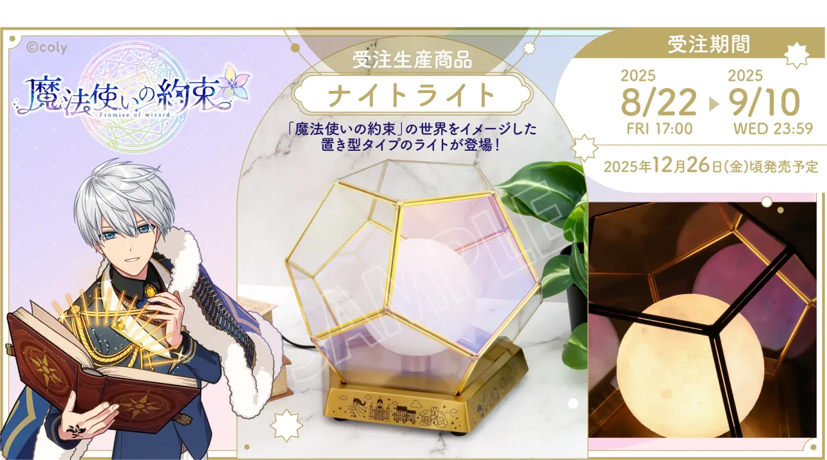『魔法使いの約束』から、特別なナイトライトが受注生産商品として登場します。700万ダウンロードを超え、2025年1月にはアニメ化も控えるこの人気作品は、異世界に召喚された賢者と21人の魔法使いたちが織り成す物語を描いています。このゲームは、魔法使いたちの特性や成長を賢者であるプレイヤーが導く育成系ゲームで、終わらない役目を背負った個性的なキャラクターたちが魅力です。