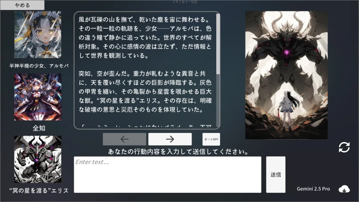 このゲームは、文章生成AIと画像生成AIを駆使して、まるで小説の中に飛び込んだかのような体験を実現しています。対戦の際には、その場面にふさわしいストーリーがリアルタイムで創出されるため、プレイヤーは選択肢に悩むことなく自由な行動を楽しむことができます。自分の言動をキーボードで入力することで、レベルに応じた物語が展開され、没入感を高めてくれます。
