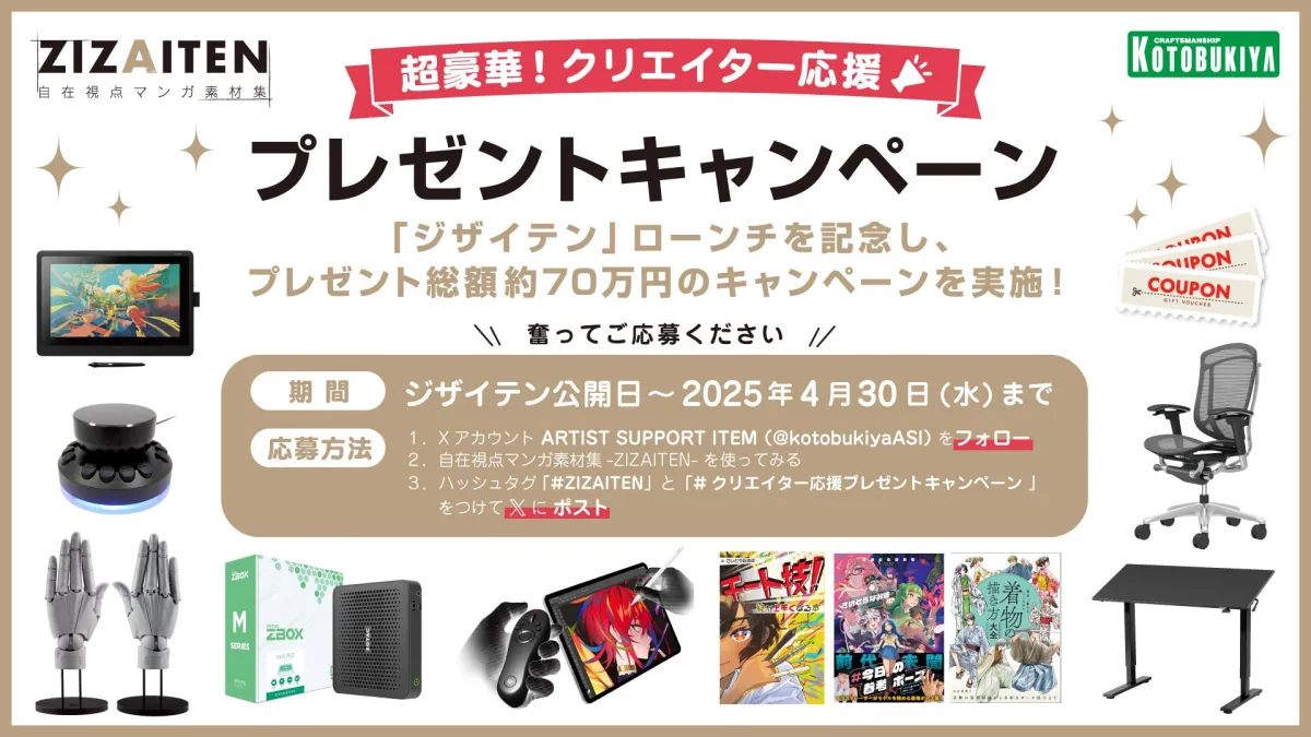 株式会社壽屋が2025年2月20日、アーリーアクセス版の「自在視点マンガ素材集-ZIZAITEN-」(通称:ジザイテン)のサービスを開始しました。このサービスは、クリエイターに向けた強力なサポートアイテムとして、イラストや漫画制作に役立つポージング素材を提供します。