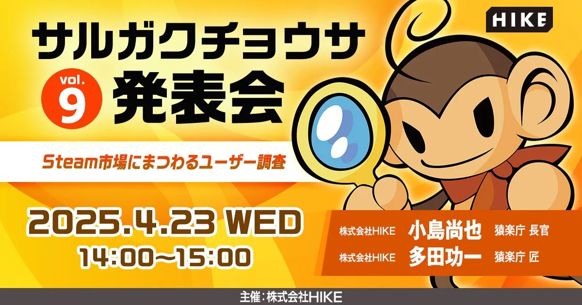 2025年4月23日(水)、株式会社HIKEが主催する無料オンラインセミナー「サルガクチョウサ発表会」が開催されることが発表されました。本セミナーでは、猿楽庁の長官・小島尚也氏と匠・多田功一氏が登壇し、2025年に行った「サルガクチョウサ vol.9 〜Steam市場にまつわるユーザー調査〜」についての詳しい内容を語ります。また、今後発行予定の「サルガクチョウサ vol.10」の一部も先行公開される予定です。