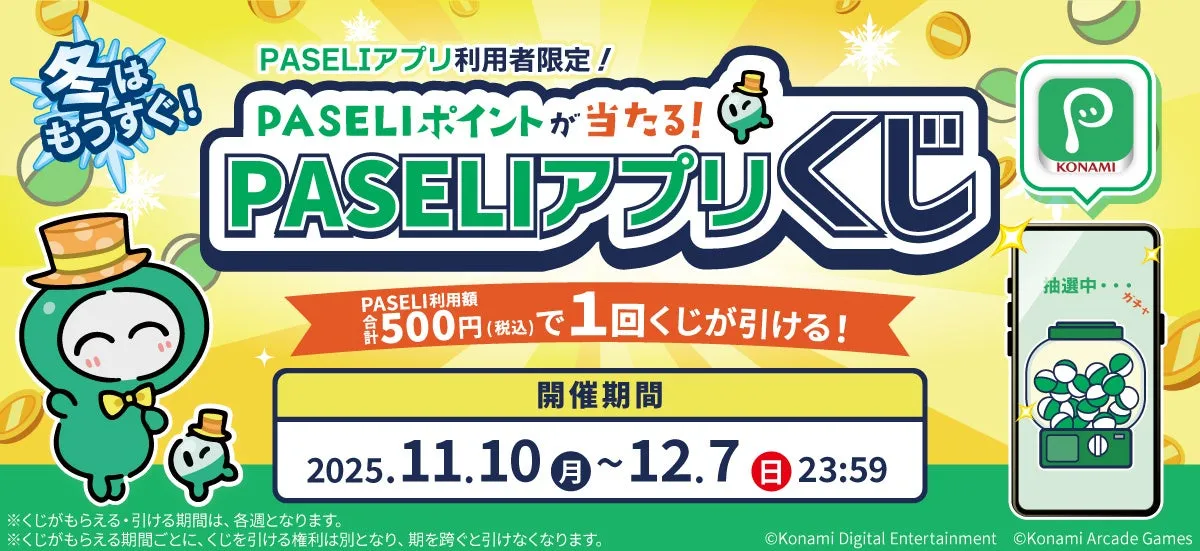 KONAMIが運営する遊べる電子マネー「PASELI」を使った特別キャンペーン「冬はもうすぐ!PASELIアプリくじ」が、2025年11月10日からスタートします。この魅力あふれる抽せん企画では、最大で3,000円相当のPASELIポイントが当たるチャンスがあなたを待っています!