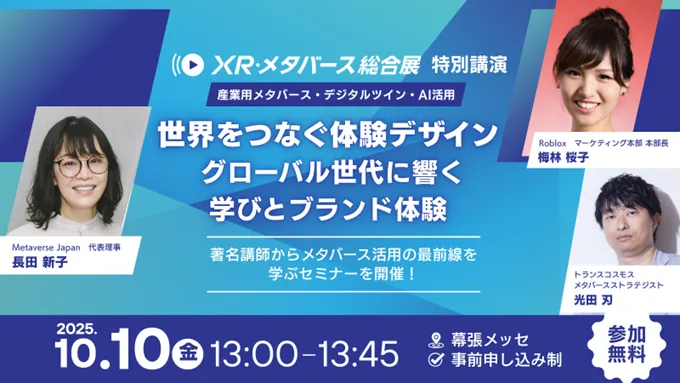 2025年10月10日(金)、幕張メッセで開催される「第5回XR・メタバース総合展」に、トランスコスモスが特別講演で登場します。トランスコスモスのメタバースストラテジスト、光田刃氏が、Robloxのマーケティング本部長、梅林桜子氏、Metaverse Japan代表理事の長田新子氏と共に、「世界をつなぐ体験デザイン」というタイトルで講演を行います。