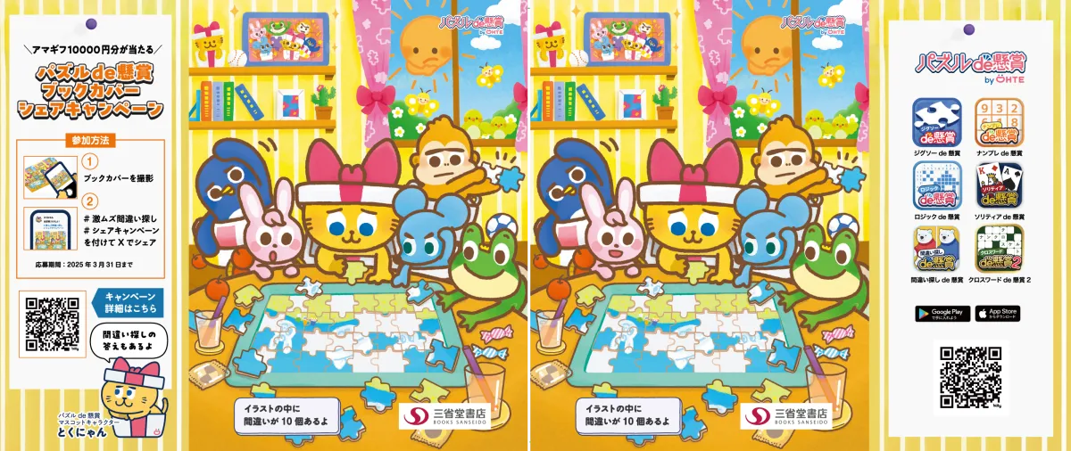 スマートフォン向けアプリ「パズルde懸賞」のシリーズが、新たな取り組みとして三省堂書店と連携し、特別なブックカバーを配布するフェアを実施します。このフェアは、2025年3月1日からスタートし、文庫本を購入したお客様に1冊につき1枚のブックカバーがプレゼントされるというものです。全国16店舗の三省堂書店で、クリエイティブなデザインのブックカバーを手に入れて、読書の楽しみを広げましょう。