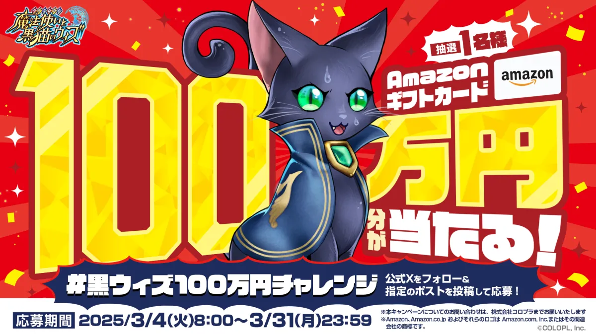 株式会社コロプラが手がける人気スマートフォンゲーム『クイズRPG 魔法使いと黒猫のウィズ』(以下『黒猫のウィズ』)は、2025年3月5日にサービス開始から12周年を迎えます。この記念すべき節目に、さまざまなキャンペーンや特典が用意されています。特に注目したいのは、豪華賞品が当たる「黒ウィズ100万円チャレンジ」。