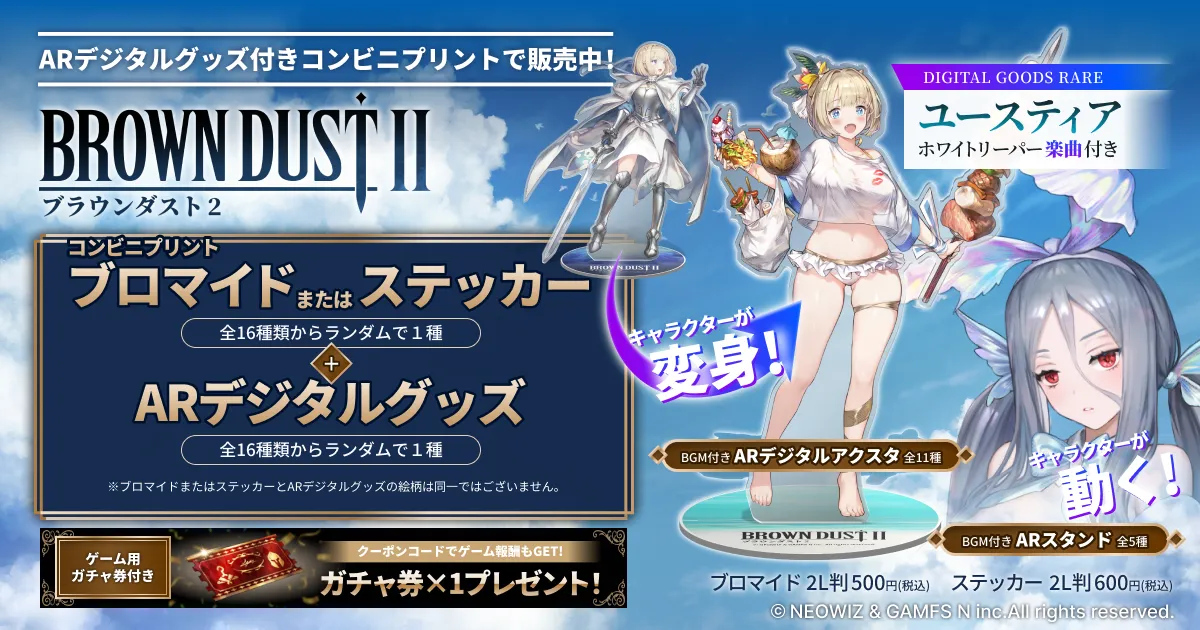 人気RPG「ブラウンダスト2」のキャラクターたちが、BGMと共に楽しめる新たな商品「変身する、動き出すARデジタルスタンド付きブロマイド・ステッカー」が、多くのファンの期待に応えて4月8日より販売されます。この商品には、ゲーム内で使える「ガチャ券クーポンコード」が付いており、ブロマイド・ステッカーは全国のコンビニエンスストアのマルチコピー機で入手可能です。