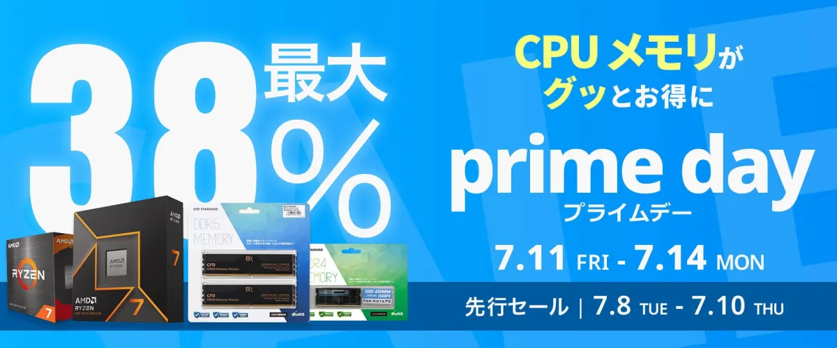 2025年7月11日から14日にかけて開催されるAmazonプライムデーの熱気が早くも高まっています。プライムデーの先行セールが7月8日から始まり、特に注目を集めているのがAMD製品やCFD販売によるメモリ製品の割引です。最大38%オフという破格の条件で、パソコンパーツの購入を検討している方にとっては、絶好のチャンスと言えるでしょう。