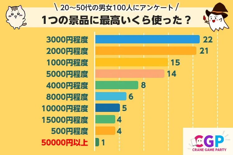 調査の結果、最も多くの票を得たのは「3,000円」で22票、次いで「2,000円」が21票を得た。この結果から、特にライトユーザー層が存在している可能性が高いことが浮き彫りになった。クレーンゲームはその手軽さゆえに多くの人々に親しまれているが、実際に高額の景品を狙う際には、自身の予算を慎重に設定する傾向があるようだ。