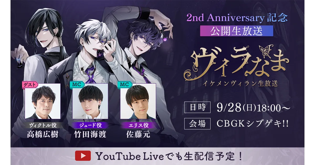 2周年を記念した公開生放送イベントは2025年9月28日(日)に開催されます。イベントのMCには、ジュード・ジャザ役の竹田海渡さんとエリス・トワイライト役の佐藤元さんが登場。ゲストとしてヴィクトル役の高橋広樹さんも加わります。特別な回顧企画や豪華朗読劇の生アフレコが用意され、ファンにはたまらない内容となるでしょう。