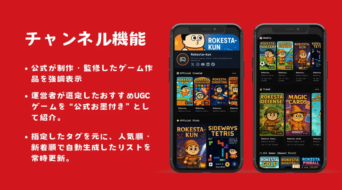 - - 公式ピックアップ: 運営者が推薦したUGCゲームを紹介し、“公式お墨付き”の信頼性を付与。