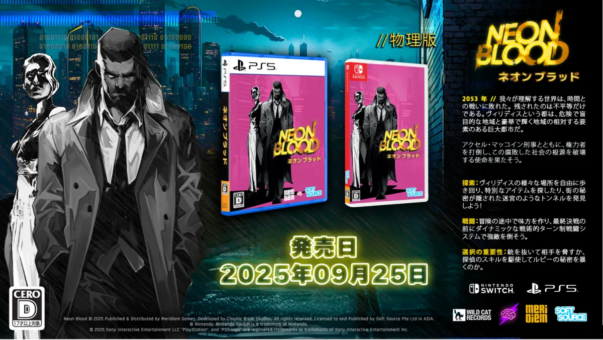 2025年9月25日、Nintendo SwitchとPlayStation 5向けに発売される『Neon Blood(ネオン・ブラッド)』が、ついに日本に登場します。このゲームは、シンガポールのパブリッシャーであるSoft Source Publishingが、Meridiem GamesとChaoticBrain Studiosと協力して制作した、ピクセルアートと3Dが融合した独特のアートスタイルが特徴の新作RPGです。