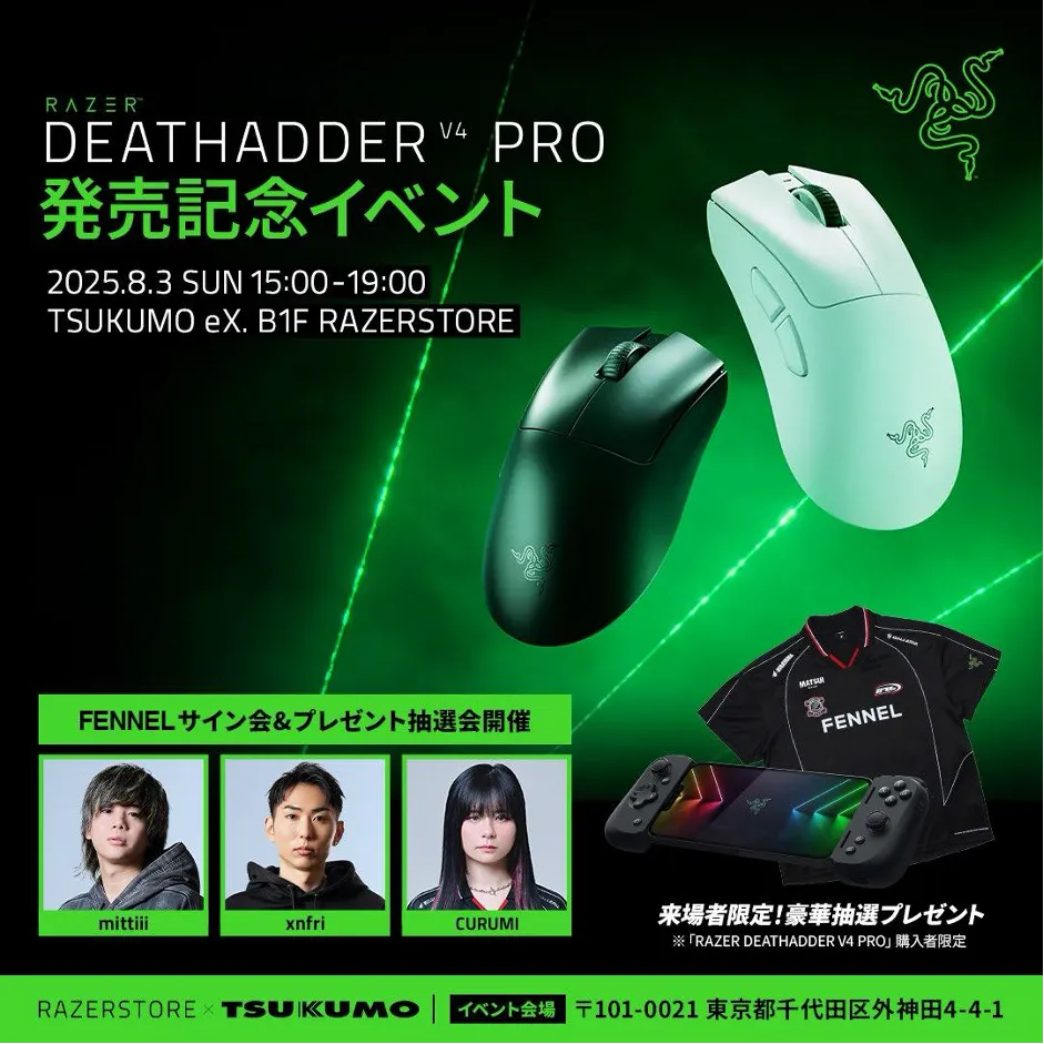 ゲーミングデバイスブランドのRazerが、最新のゲーミングマウス「DEATHADDER V4 PRO」発売を祝して特別なイベントを開催します。2025年8月3日(日)の15時から19時まで、東京のTSUKUMO eX. RAZER STOREで行われるこのイベントは、ゲーマー及びRazerファンには見逃せない機会です。